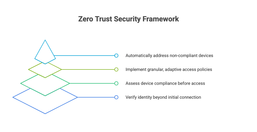 - Evaluate device posture (OS version, patch level, compliance) before granting full access.